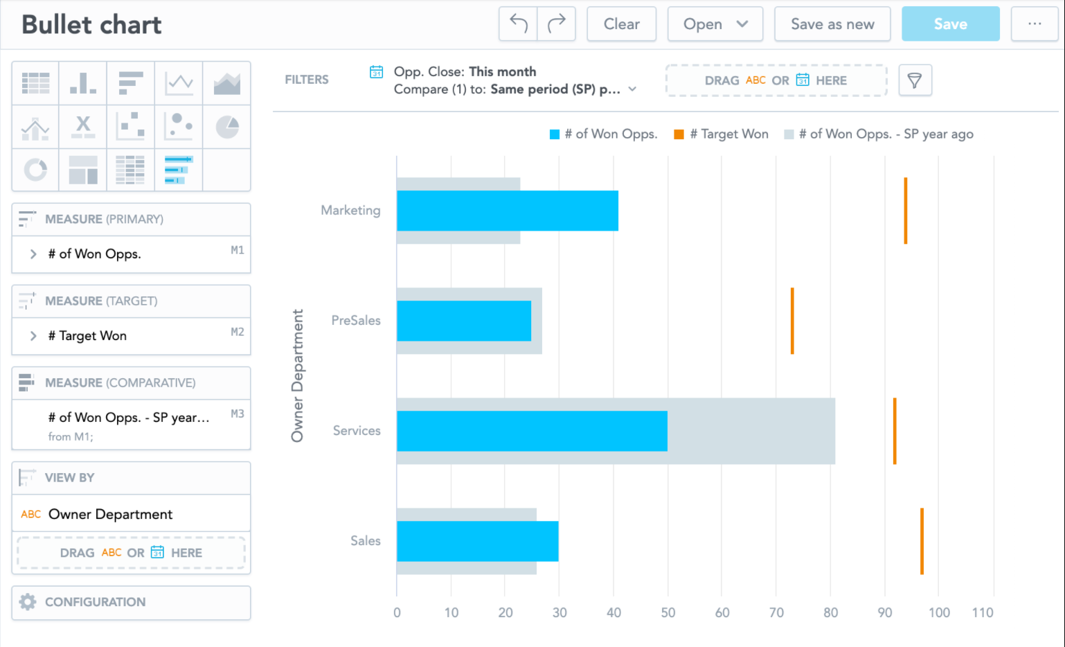Bullet charts have the following sections: Measure (Primary), Measure (Target), Measure (Comparative), View by, and Configuration.