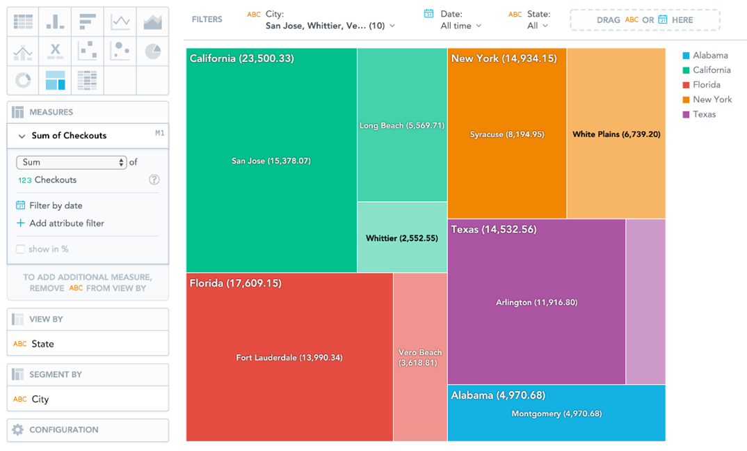 Treemap have the following sections: Measures, View by, Segment by, and Configuration.